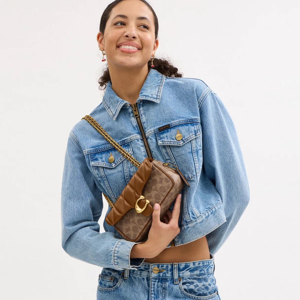 Signature coated canvas and nappa leather Inside magnetic snap pocket Pushlock closure, fabric lining Outside slip pocket Chain strap with 54.5cm drop for shoulder or crossbody wear 20cm (L) x 11cm (H) x 7cm (W)