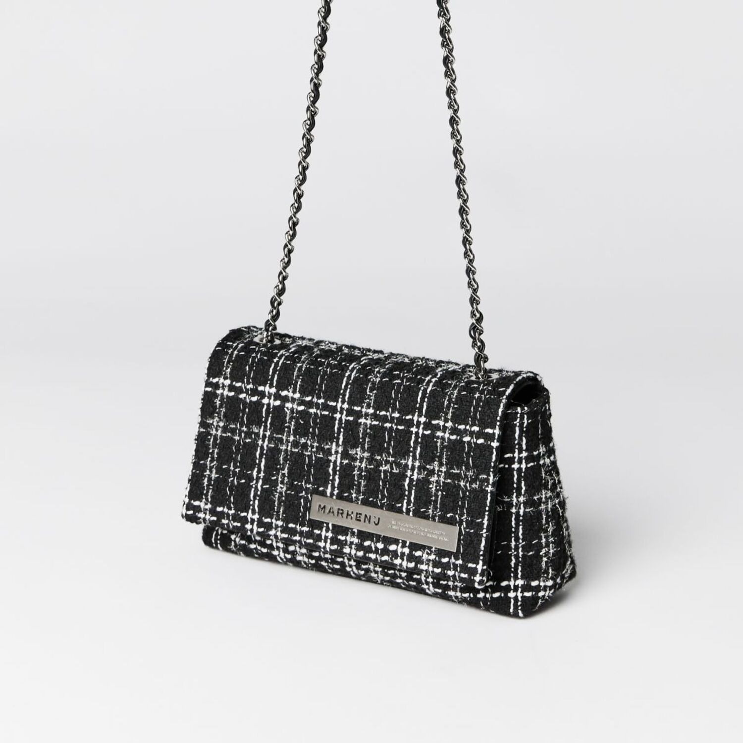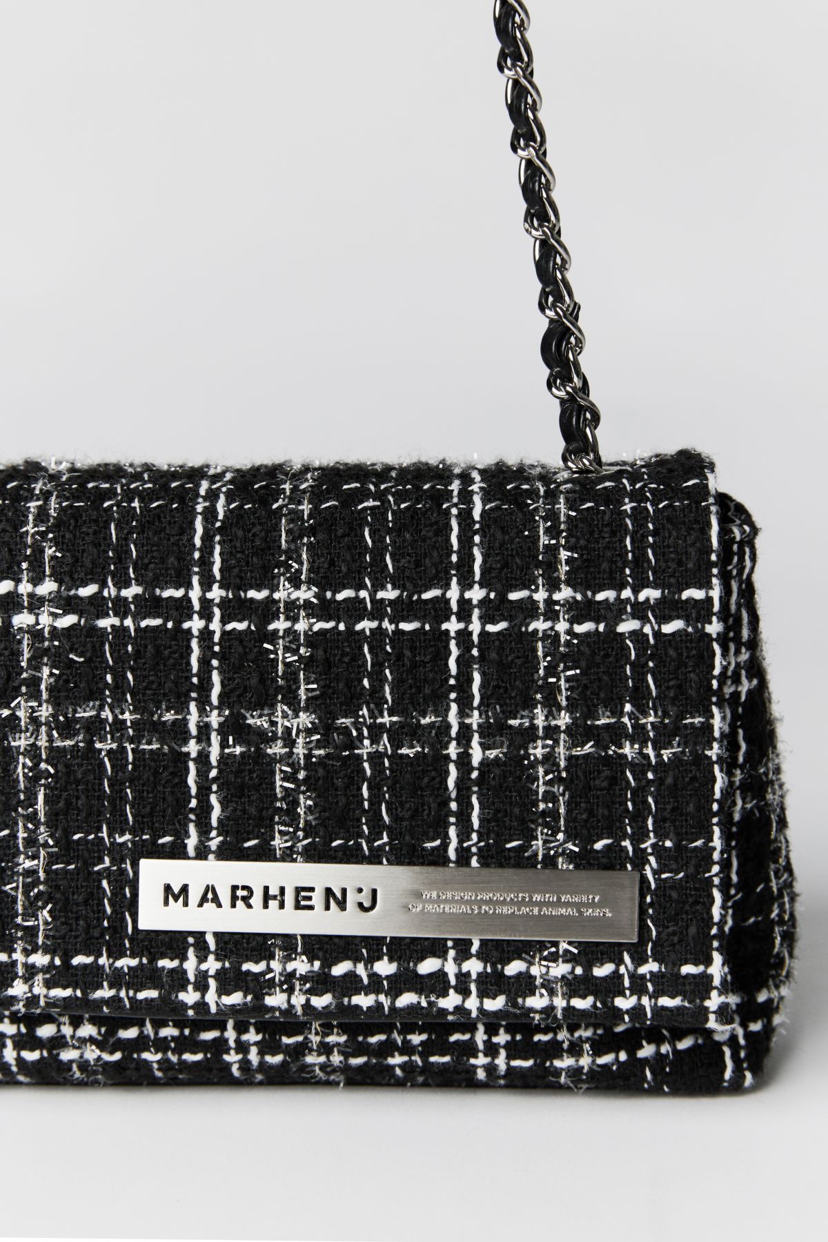 JE T’AIME bag combines a luxurious tweed texture with subtle pearlescent thread, capturing a warm and romantic feel. It can be worn as a shoulder bag with the chain strap, while the metal logo emblem adds a refined touch. Made from high-quality material that closely resembles wool, it is softer, lighter, and equipped with water-resistant features, making it a practical piece.