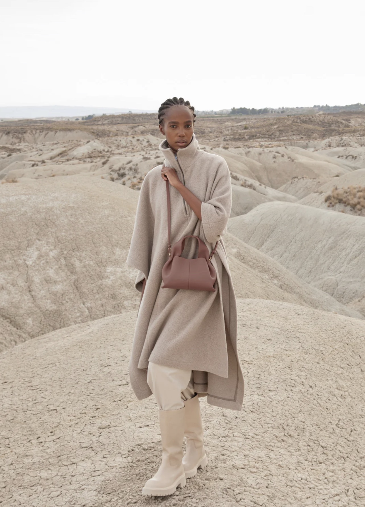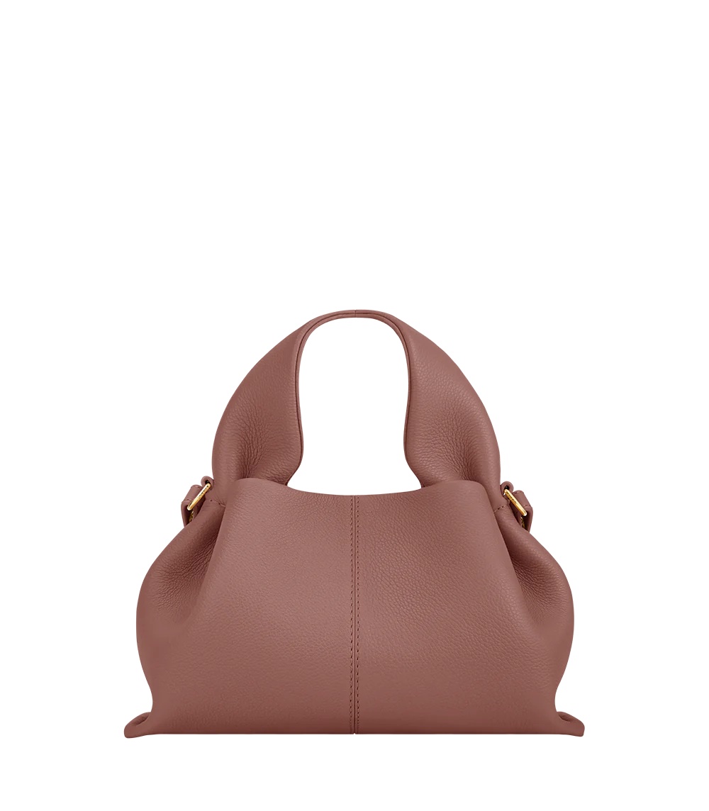 Made by leather goods artisans in Ubrique, Spain. Leather draping held in place by hand stitching. Certified Italian full-grain textured calf leather. Handbag, shoulder bag, or crossbody.